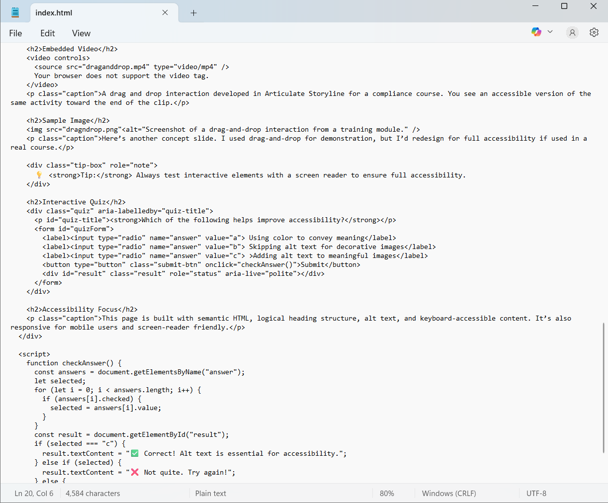 This responsive and accessible page includes embedded video, alt text, a hover-triggered tooltip, a quiz question, and mobile-friendly design. It’s a lightweight, SCORM-compatible demo that shows how HTML5 can power flexible, LMS-ready learning, perfect for microlearning modules, embedded help systems, or seamless platform integration.