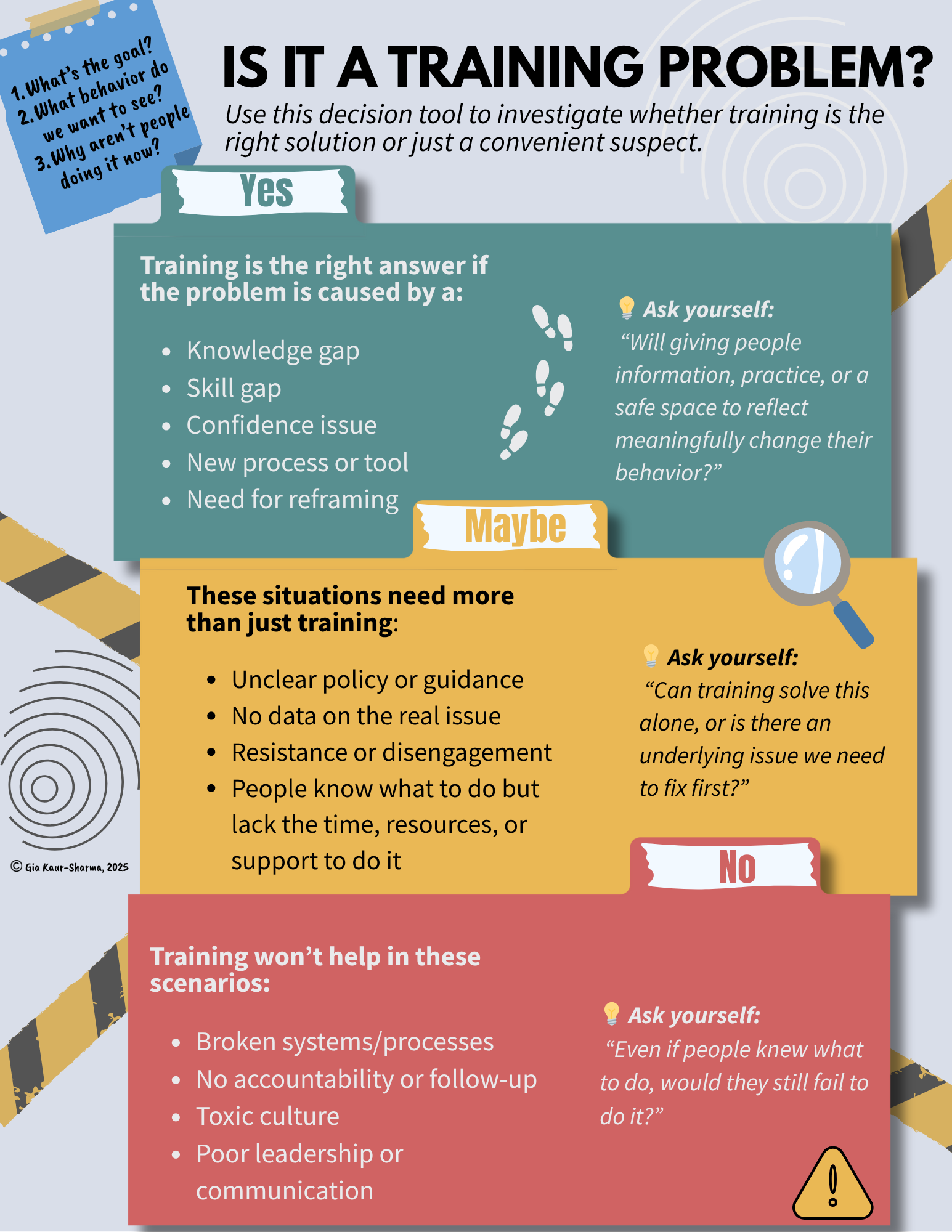 Using that principle, I developed a set of diagnostic questions to help learning professionals pause, assess, and decide whether training is the right solution, or if a job aid, conversation, or process fix might be more effective.