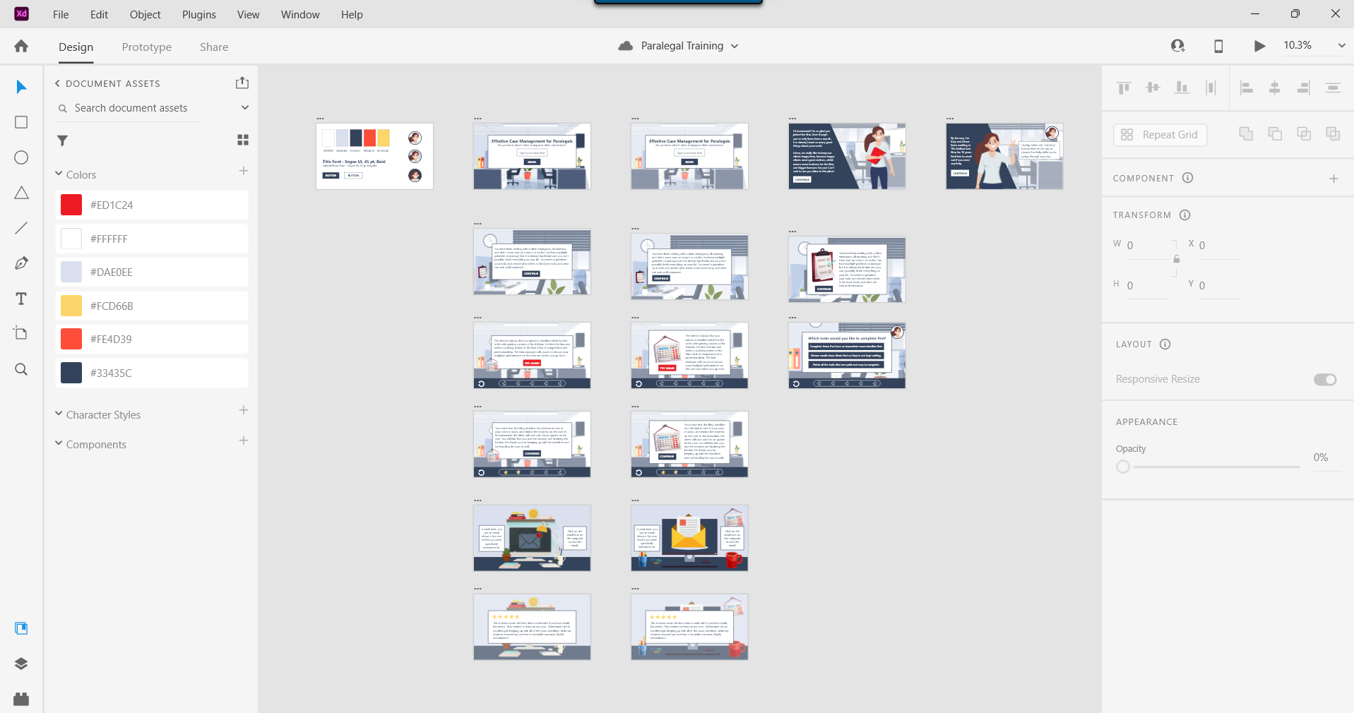 Once the storyboard came together, I moved forward to designing the visual mockups in Adobe XD. Since law firms can be fairly conservative environments, I chose a clean aesthetic with straight lines, conservative fonts, colors that evoke professionalism, and a professional (but friendly) looking mentor character.