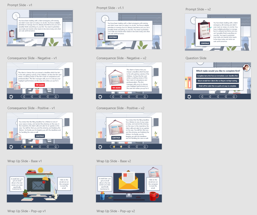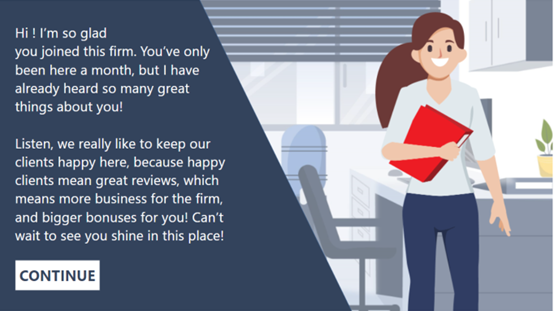 This concept project allows newly hired paralegals to practice the soft skills needed to manage their cases effectively. It is a story-driven, scenario-based eLearning course designed to let the learners experience real-world situations at a law firm and real-world consequences for their actions.