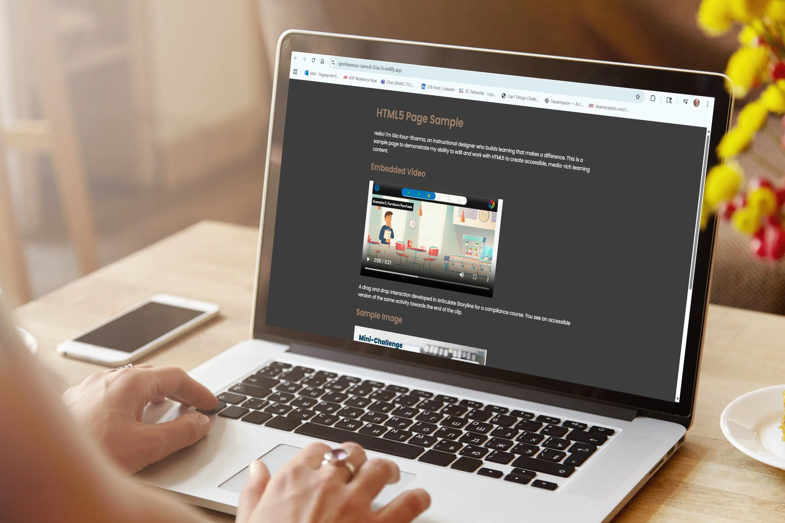 An accessible and responsive webpage built using HTML5 and CSS. Features an embedded video clip and a screenshot from one of my eLearning courses.