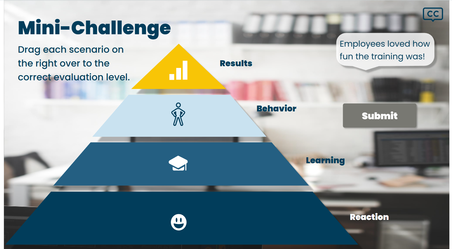Rapid‑Fire Drag‑and‑Drop Finale – A final classification challenge reinforces the four levels by having learners match mini‑cases to the Kirkpatrick pyramid.