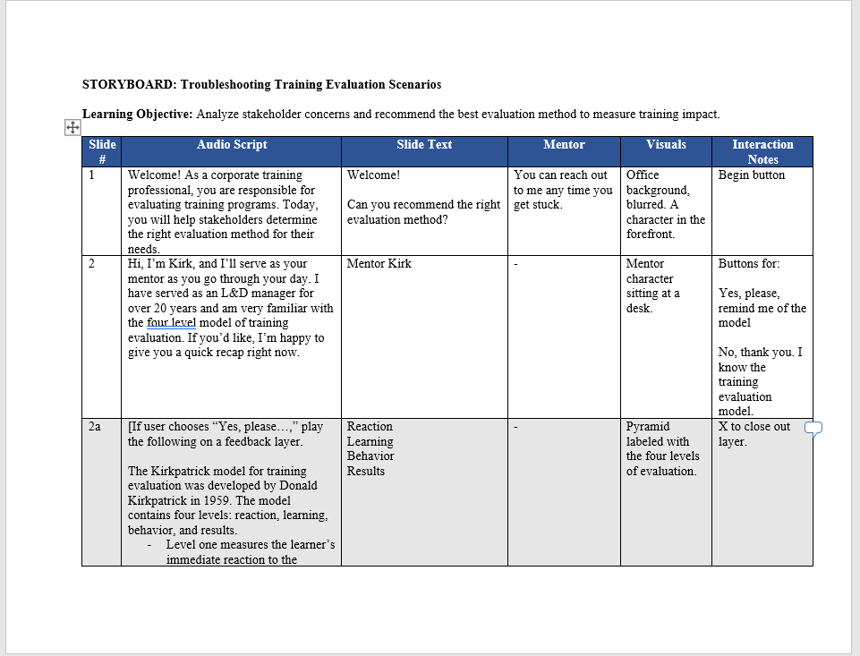 I created a streamlined storyboard in Word that mapped every slide’s audio, on‑screen text, mentor hint, visuals, and interaction notes in one view. This single‑source blueprint kept development tight, under ten slides, and let stakeholders preview flow, tone, and accessibility features before I worked out the variables and triggers in Storyline.